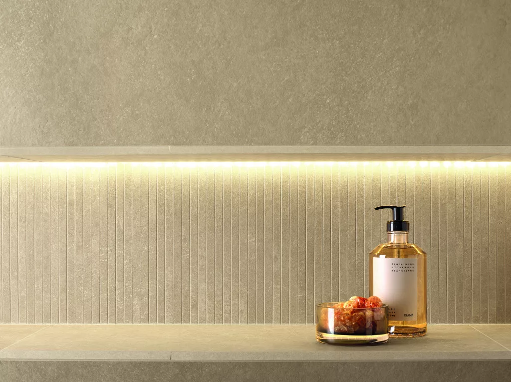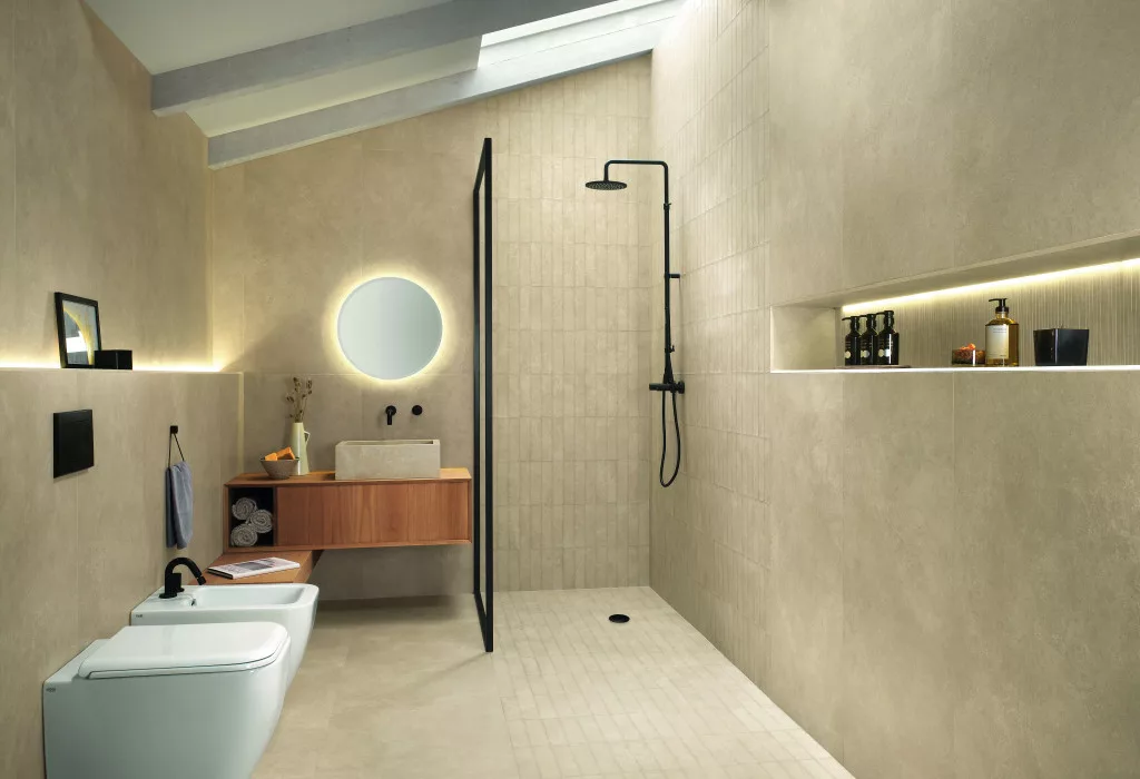 – Fürdőszobák padlójaként, ahol a kőhatású felület és R9 biztonság együtt fontos.